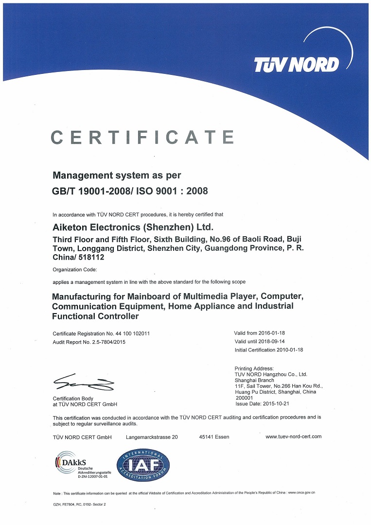 As a reliable supplier in the manufacturing industry, Aiketon has been certified for ISO 9001:2008 and TS 16949:2009.